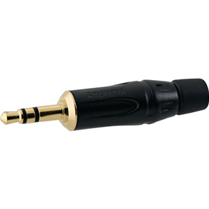 Connettore jack maschio stereo da 3.5 mm della Amphenol,montaggio su cavo,corpo nichelato nero e spinotto in metallo dorato.Connettore di alta qualità per applicazioni professionali.