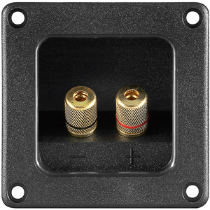 Morsettiera in plastica con morsetti serracavo dorati,adatta per casse acustiche HI-FI; accetta cavi con sezione sino a 6 mmq.oltre alla banana diametro 4 mm.