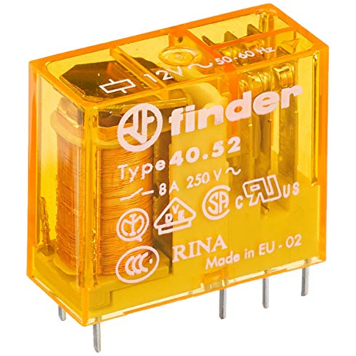 Relè a 2 scambi,tensione 12 VAC,portata 8 A@250VAC,versione per circuito stampato.